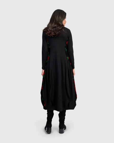 Soft jersey meets tonal velvet in a sleek cocoon silhouette designed for day-to-night versatility. This long sleeve dress is cut close through the bust and shoulder before tapering gently for ease through the hips. Pieced panels add subtle structure, while a crew neckline and practical pockets keep the profile clean and effortless. Side pockets.