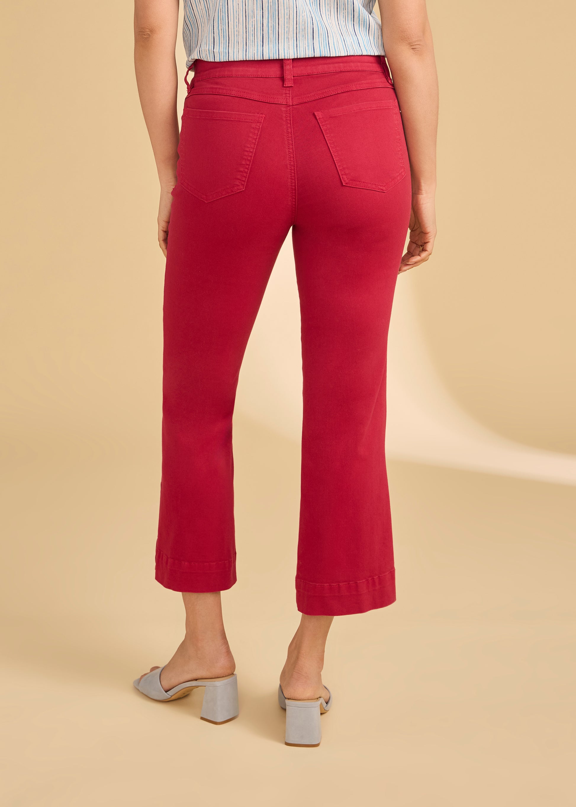 FDJ's pull-on boot crop jeans combine comfort with contemporary style. Crafted from durable euro twill fabric, these jeans feature a convenient pull-on design that eliminates the need for a traditional zipper. The boot crop silhouette flatters various body types while remaining versatile for everyday wear. Distinctive buttons accent the outer lower seam, adding visual interest to the leg opening. The vibrant red colour makes a bold statement, perfect for those seeking to elevate their denim collection with a standout piece that transitions seamlessly from casual to dressed-up occasions. 89% Cotton, 10% Polyester, 1% Elastane. 26" inseam