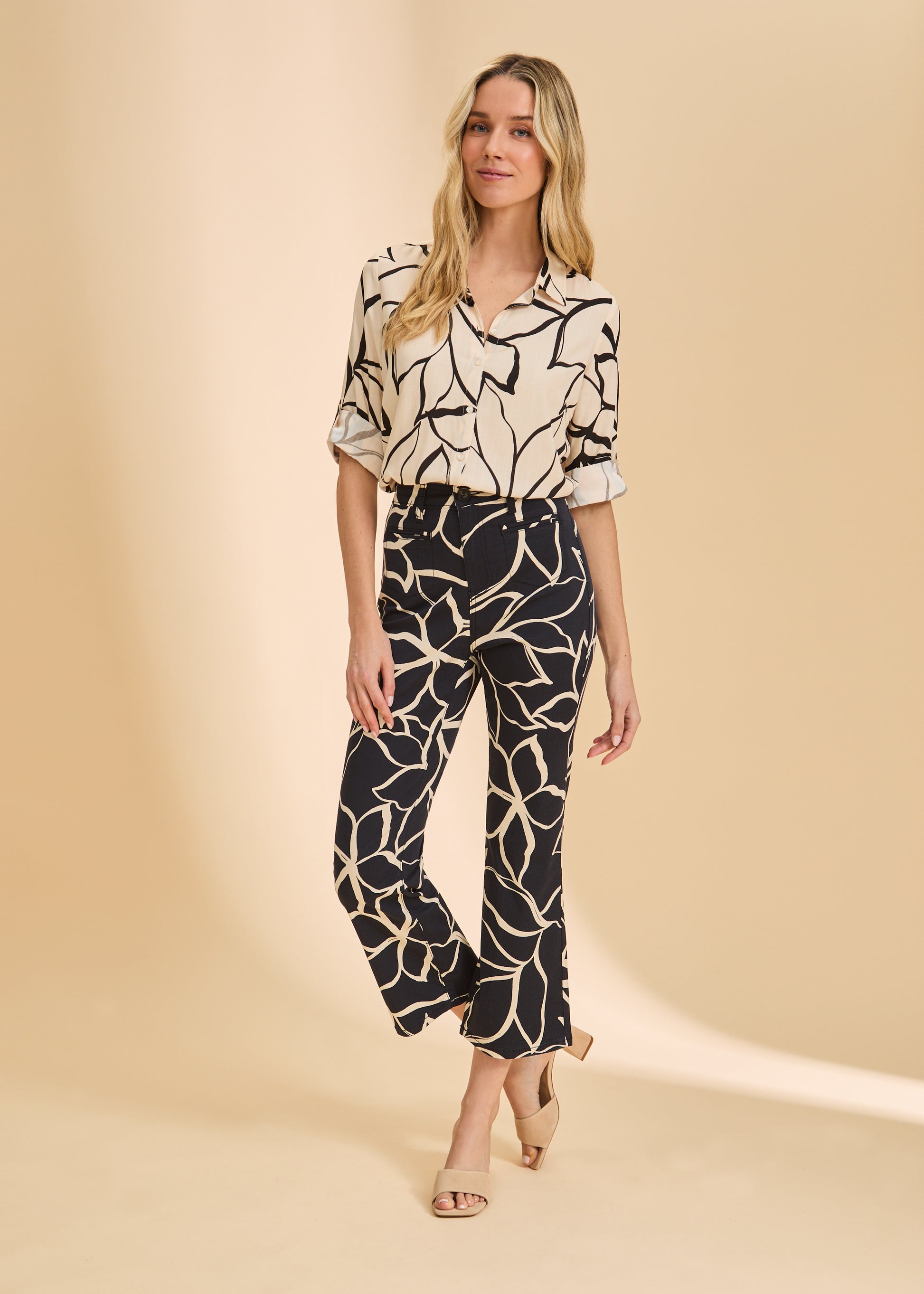 FDJ's Suzanne Printed Boot Crop features a striking black and white abstract floral pattern that elevates any ensemble. Constructed from lightweight twill, these pants offer breathable comfort without sacrificing structure or durability. The boot crop length provides a contemporary silhouette that works beautifully with both flats and heels. The printed design adds visual dimension while remaining versatile enough to pair with solid tops and accessories. A sophisticated choice for those seeking statement pieces that maintain professional polish and everyday wearability. 50% Cotton, 48% Viscose, 2% Elastane. 26" inseam