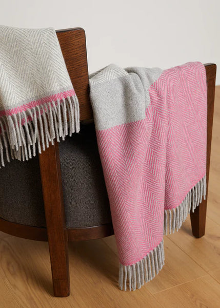 This exquisite Foxford Lily Cashmere and Lambswool Throw is handwoven at our County Mayo mill using traditional techniques, using only the finest cashmere and lambswool. The striking fiesta pink and pearl grey herringbone pattern lends a vibrant and lively touch, making it a must-have for any home looking to create a summery ambiance.