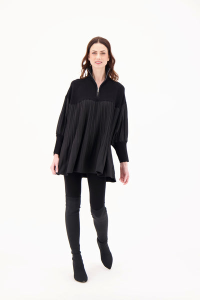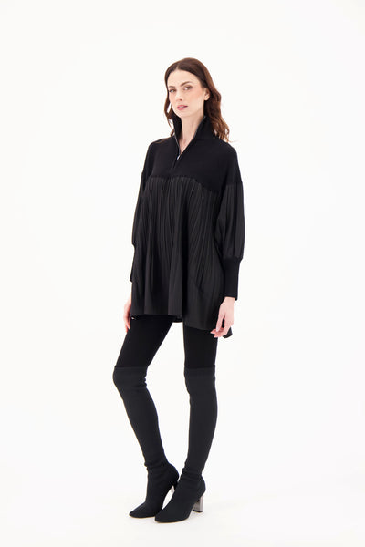 The Gabby Isabella Pleated Top combines delicate pleating with knit cuffs on the sleeves and bodice, offering a textured yet comfortable fit. Its zip-front design ensures easy wear while maintaining a sleek, tailored silhouette ideal for both professional and casual settings.
