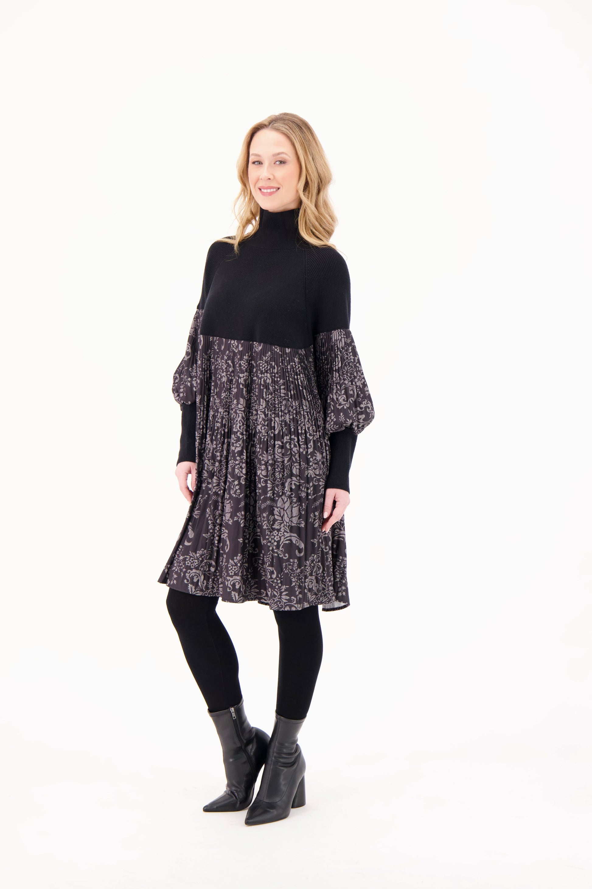 This Gabby Isabella dress features a sophisticated pleated print skirt paired with a sleek black knit bodice and sleeves. The combination offers both visual interest and comfortable wear, making it an ideal choice for occasions that demand elegance with ease. The knit fabric ensures a flattering fit while the pleated skirt adds movement and texture to your silhouette.