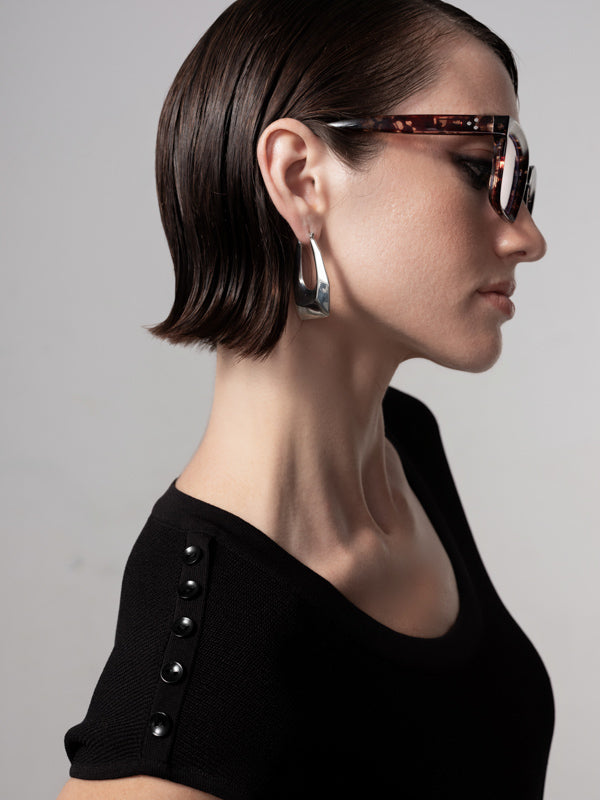 This refined knit tee combines 65% Rayon and 35% Nylon for a luxuriously soft drape with exceptional durability. The distinctive button shoulder detail adds an unexpected design element, elevating the piece beyond basic essentials. Rayon's natural breathability pairs seamlessly with nylon's resilience, creating a fabric that moves with you while maintaining its structure. Perfect for those seeking understated sophistication with thoughtful construction details that distinguish everyday wear.