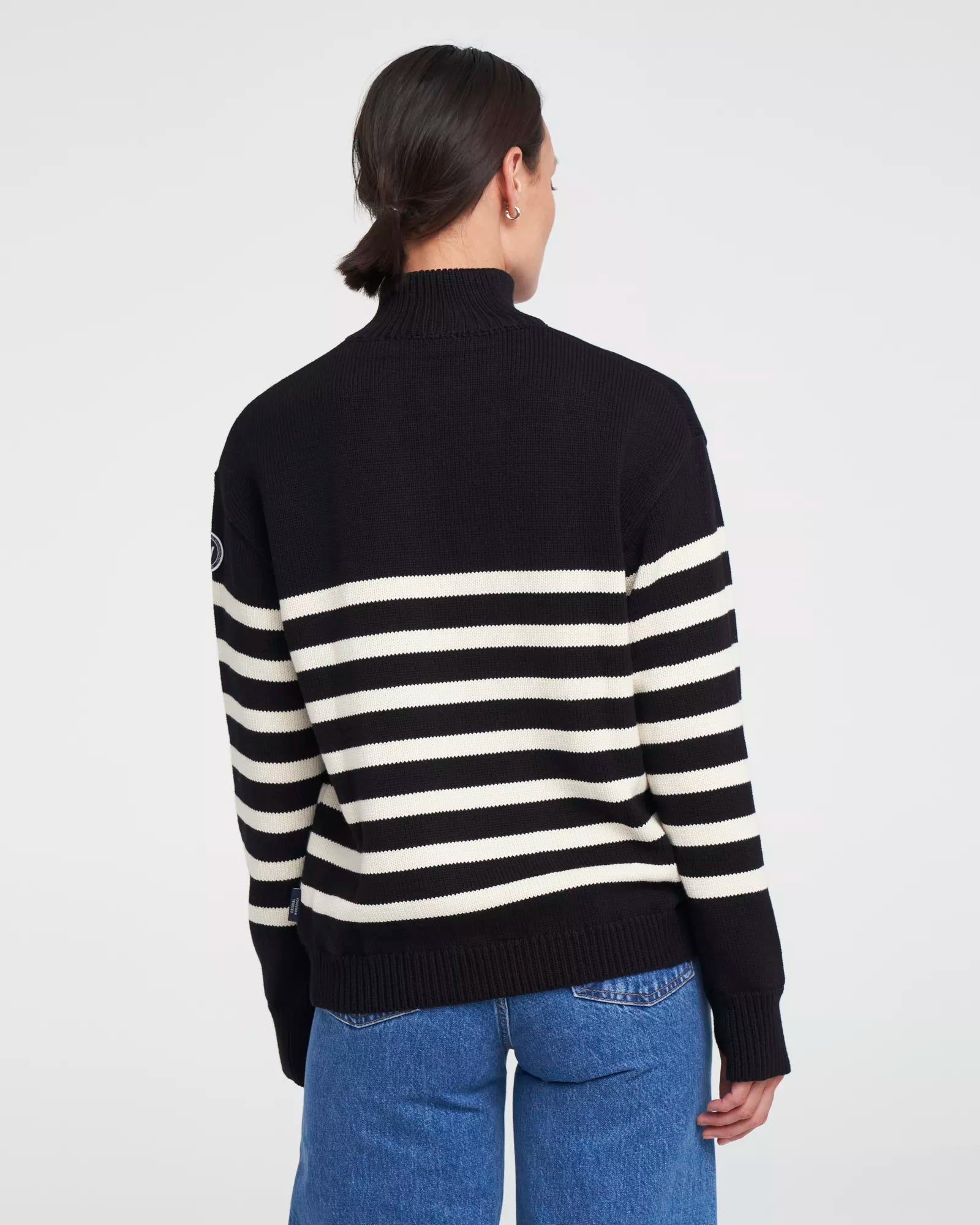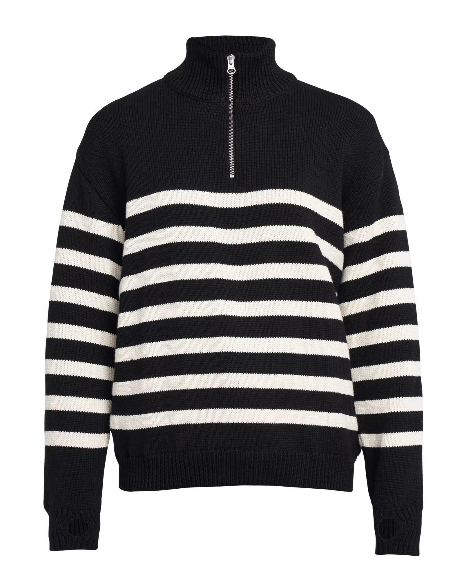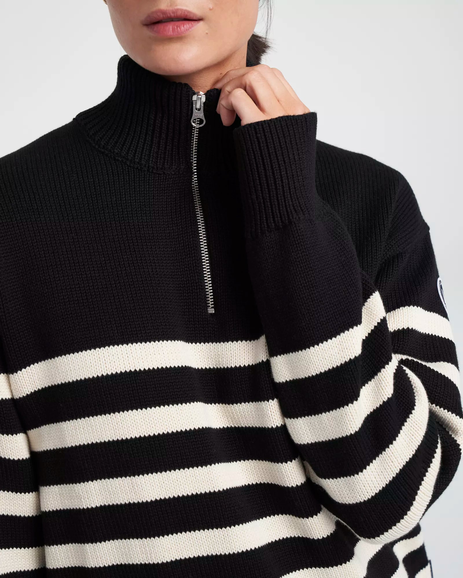 A knitted windproof sweater in cotton with classic stripes. Relaxed fit with dropped shoulder and metal zip at front. The sweater has elastic windproof lining (96% polyester, 4% elastane).