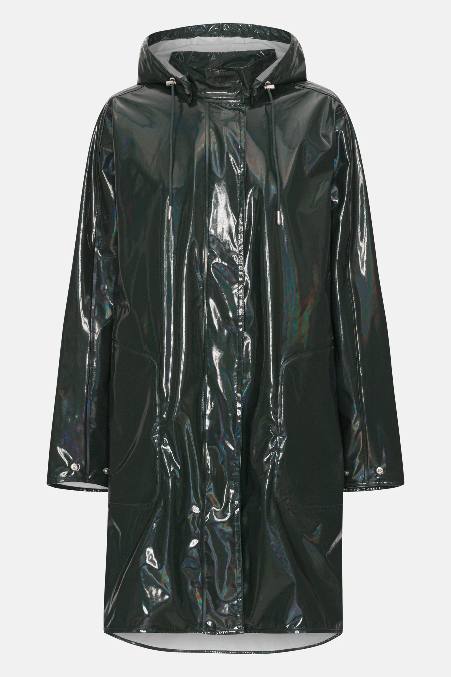 A functional and feminine midi-length raincoat in a glossy waterproof PU fabric. This style features a functional hood, adjustable sleeve cuffs, welded seams and a storm front closure with YKK 2-way zipper. A waterproof rating of 3000 mm will be enough for light showers in a urban setting.