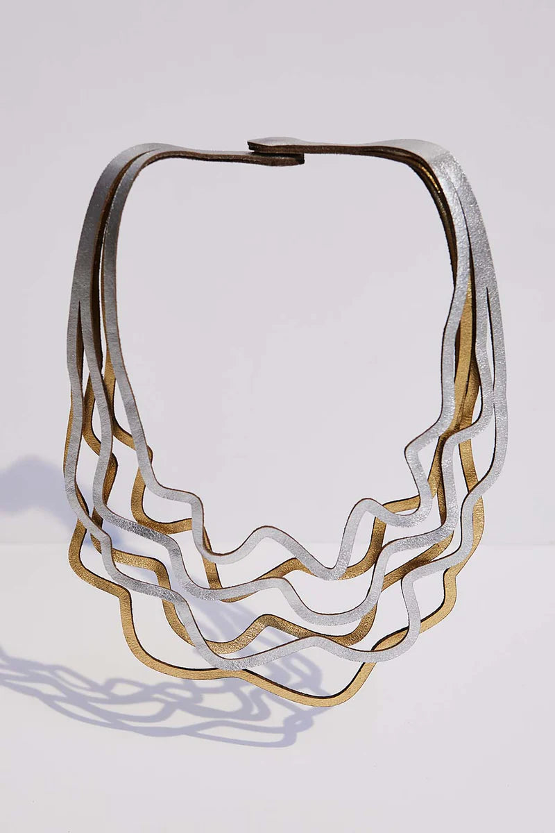 Curves Duo features 100% Argentine laser-cut leather that is coated to give the appearance of gold and silver strands. Because the leather is light and soft, the strands of the necklace play beautifully on bare skin or any fabric. When you move, the necklace also creates a slight natural movement that accentuates the sparkle of the gold and silver strands.