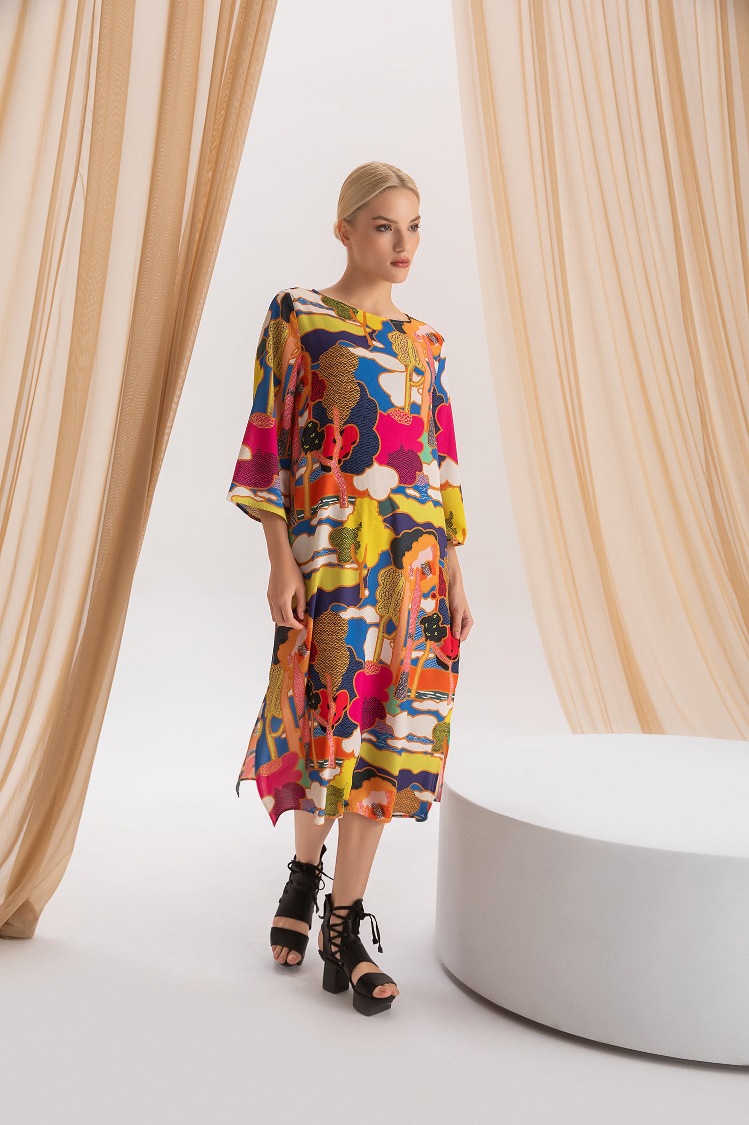 Shown in print - Leaf. Available in print - Misaki (see swatch and model image for larger scale print definition)