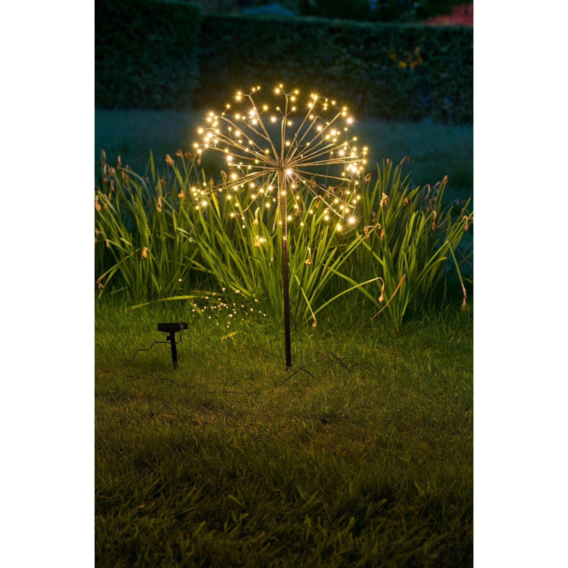 The larger size has 120 warm white LEDs with an illuminated diameter of 17.7 inches, while the smaller size has 96 warm white LEDs with an illuminated diameter of 13.8 inches. Both have a total height of 39.4 inches and a 9.8-foot lead to the solar panel, which can be positioned to best catch the sunlight. The lights are solar powered with a built-in rechargeable battery. The solar panel dimensions are 3.5 inches x 3.3 inches x 0.8 inches. The item is made from metal with the primary color being dark brown.
