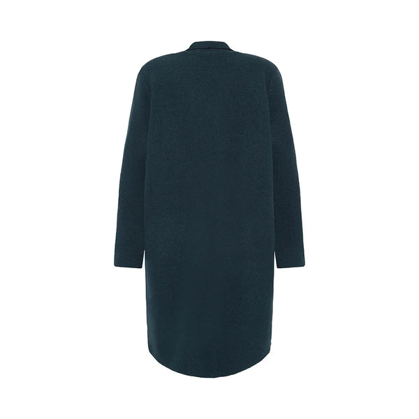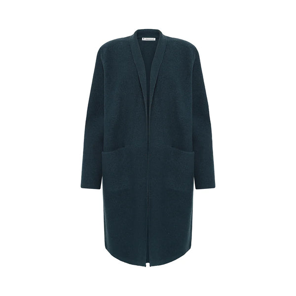 quality : 100% woolknit : knitted boiled woolshape : long open jacket with relaxed fitdetail : the jacket has raw edges and no lining, small collar, pockets and a metal pin for closure