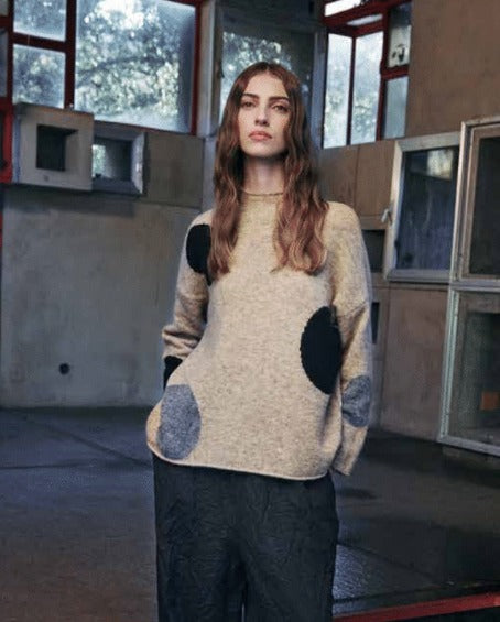 The NEIRAMI Mock Turtleneck combines a sophisticated mix of 50% acrylic, 31% polyamide, 12% wool, 5% alpaca, and 2% elastane for a balanced blend of softness, warmth, and stretch. Featuring a beige base with large black and grey dots, its boxy shape offers a contemporary, relaxed fit that enhances layering options while maintaining a polished look. Ideal for those seeking expert craftsmanship and versatile style in cooler weather.