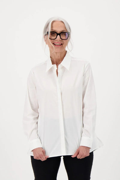 This button front shirt is crafted in a beautiful wrinkle-free stretch poplin. For comfort and ease, this shirt has slits at the sides to show off high-waisted styles and hidden side pockets that are decorated with rivets.