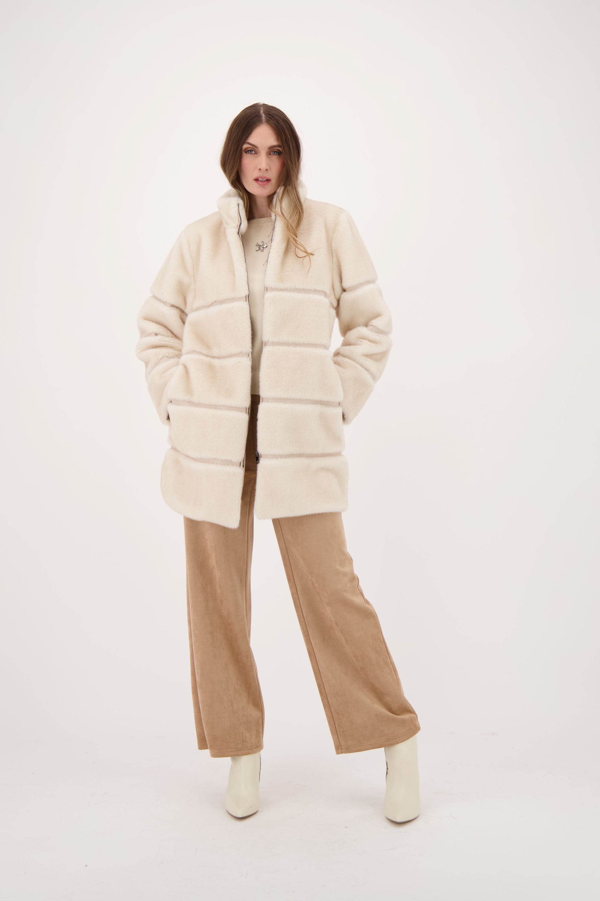 This ivory faux fur coat combines luxurious softness with practical design. Featuring a convenient zipper front for easy wear and secure closure, it also includes pockets to keep essentials close at hand. Ideal for adding warmth and style to your wardrobe with expert craftsmanship and attention to detail.