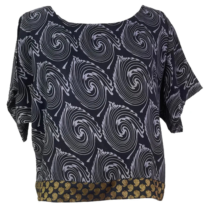 These sustainable, pure silk boxy tops are versatile and come in countless colors and prints. They look great when paired with a longer tank top and high-waisted pants, or beneath a coordinating kimono-sleeved duster, short kimono-sleeved jacket, or silk poncho. These pieces are one size fits most.