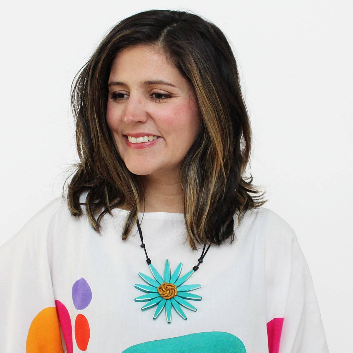 A wearable piece of art, this handmade pendant necklace is one of a kind. A handcrafted wooden flower in a vibrant teal color carved out and hung on an adjustable black wax cord. The middle of the flower is made up of a cluster of tiny beads that add a 3D effect to the necklace. Wear this necklace over your favorite tee or dress along with the coordinating earrings.