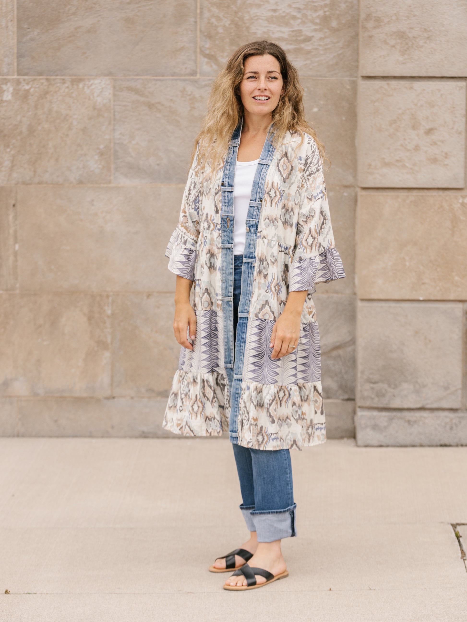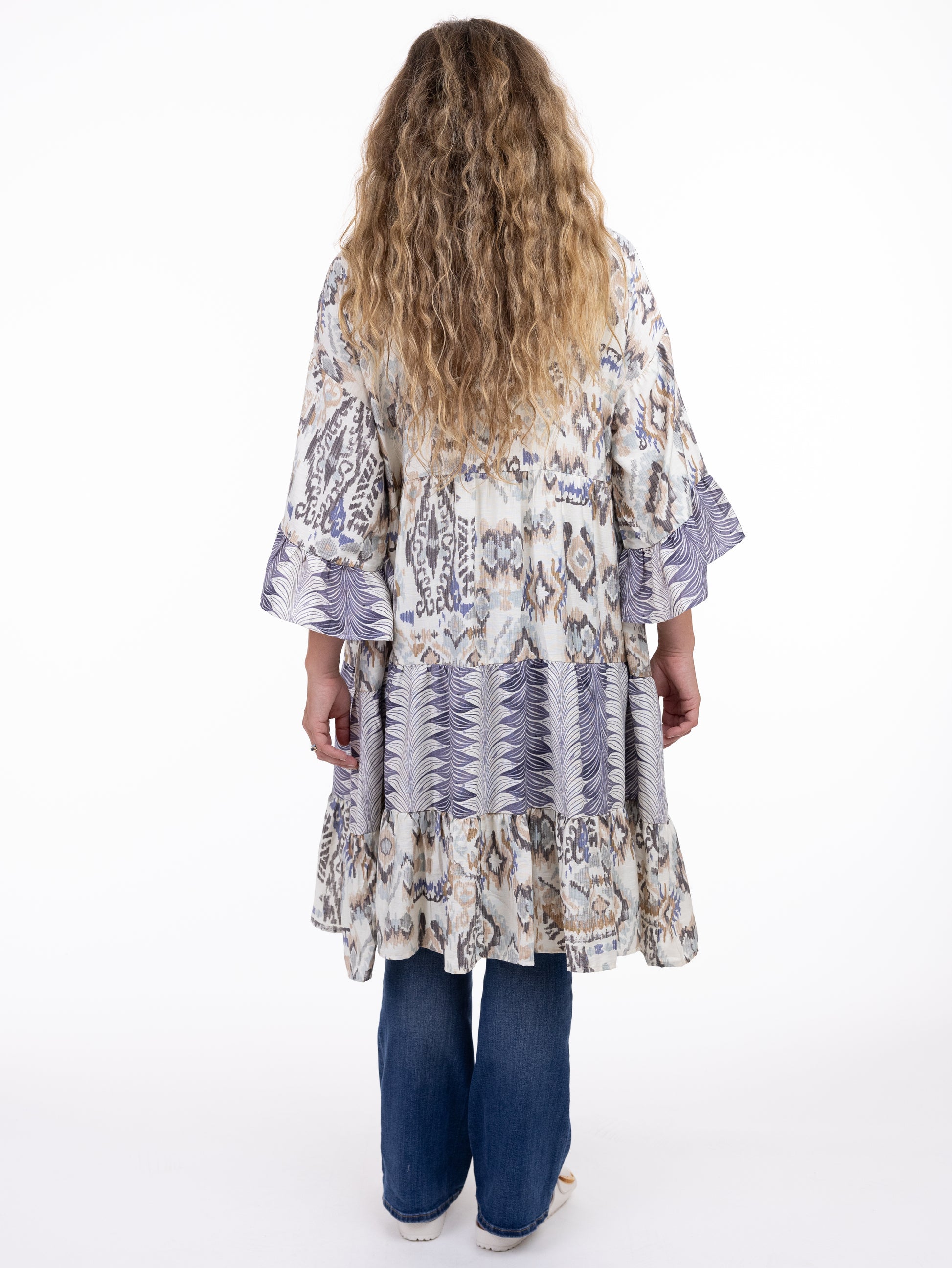 Printed rayon with denim trim. Designed in Canada. Made in Thailand